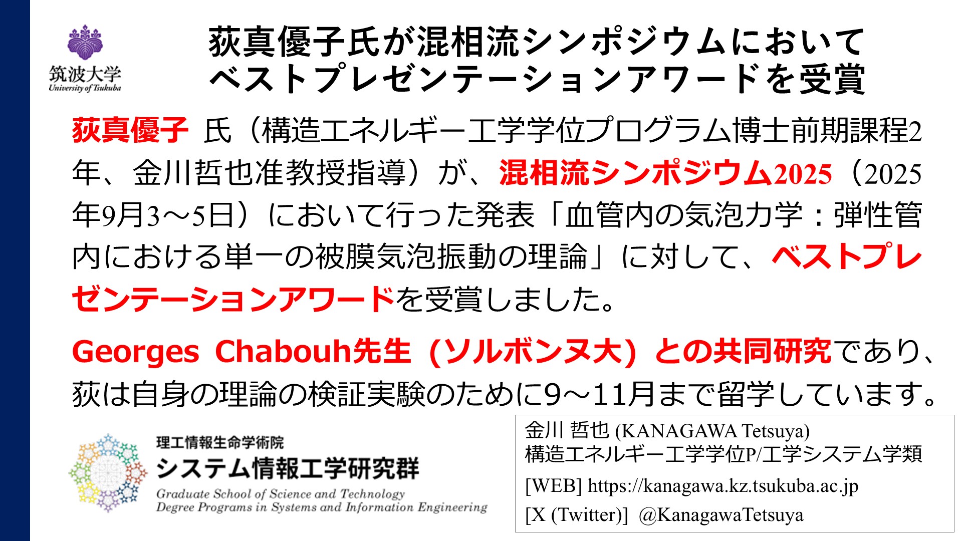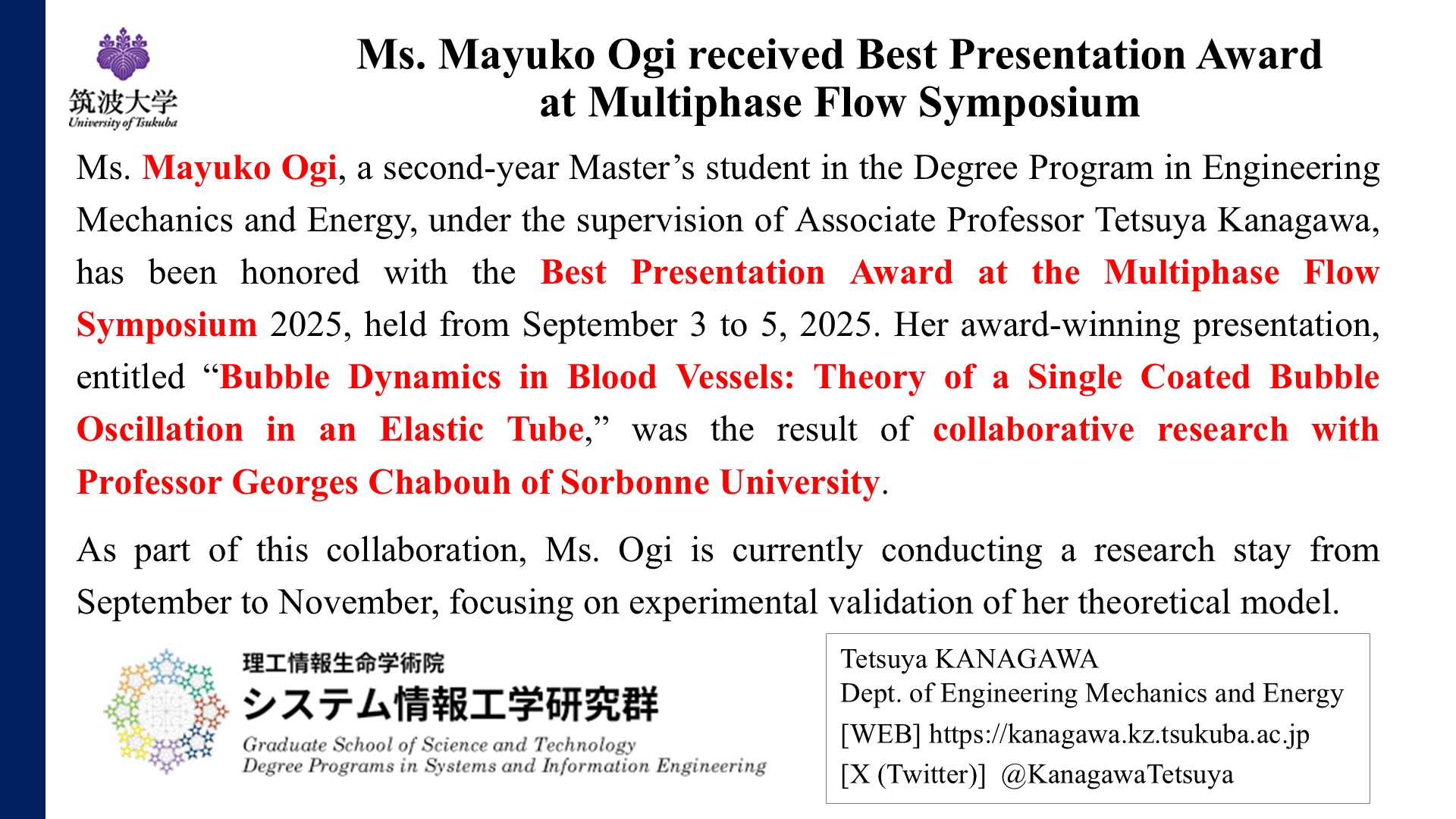 2025年9月23日 Sep. 23. 2025 荻真優子氏が混相流シンポジウムにてベストプレゼンテーションアワードを受賞 Ms. Mayuko Ogi received Best Presentation Award at Multiphase Flow Symposium