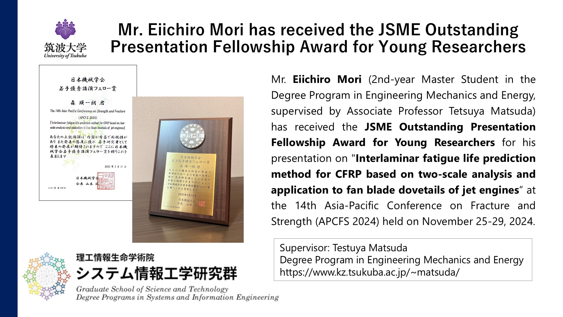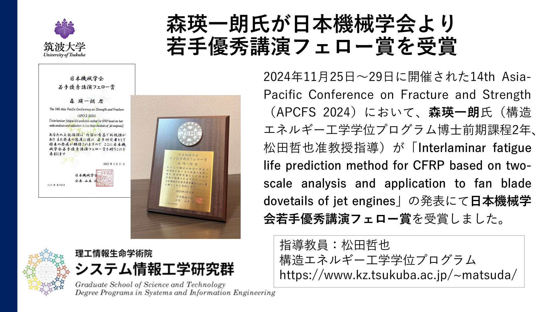 2025年9月26日 Sep. 26. 2025 森瑛一朗氏が日本機械学会より若手優秀講演フェロー賞を受賞 Mr. Eiichiro Mori has received the JSME Outstanding Presentation Fellowship Award for Young Researchers