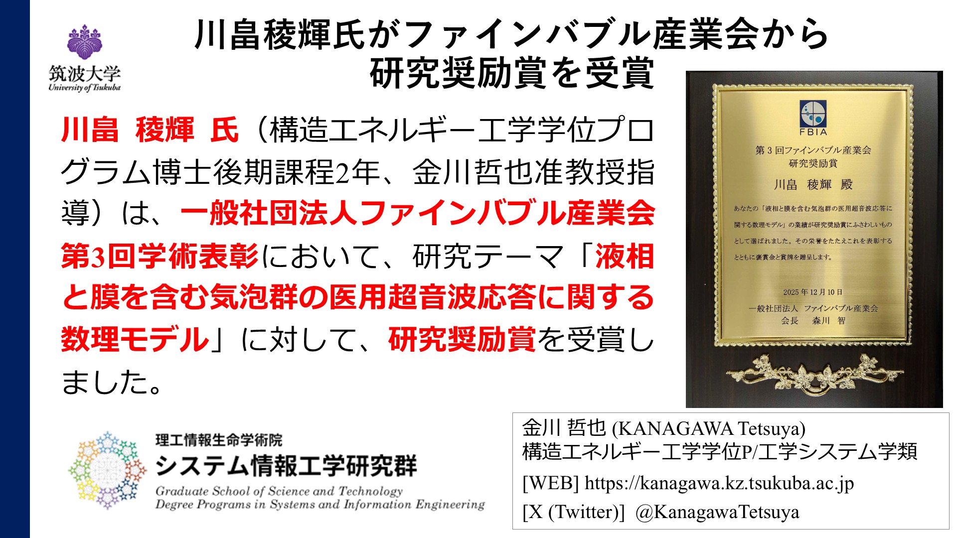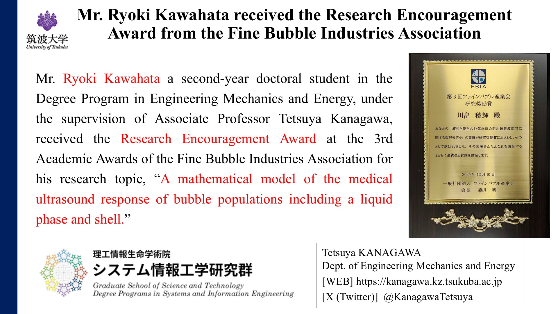2025年12月26日 Dec. 26. 2025 川畠稜輝氏がファインバブル産業会から研究奨励賞を受賞 Mr. Ryoki Kawahata received the Research Encouragement Award from the Fine Bubble Industries Association