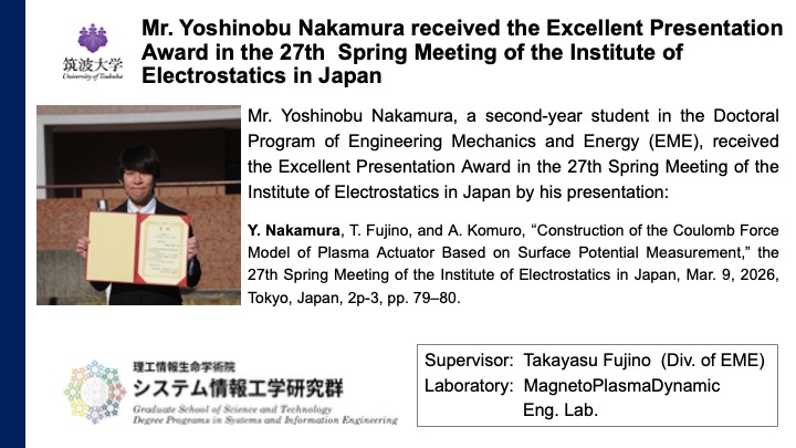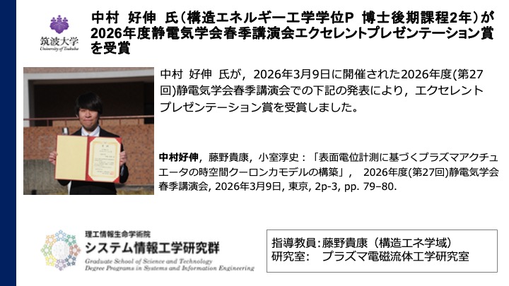 2026年3月12日 Mar. 12. 2026 中村好伸氏が2026年度静電気学会春季講演会エクセレントプレゼンテーション賞を受賞 Mr. Yoshinobu Nakamura received the Excellent Presentation Award in the 27th Spring Meeting of the Institute of Electrostatics in Japan