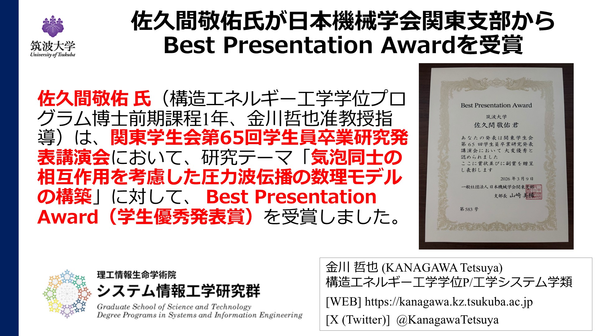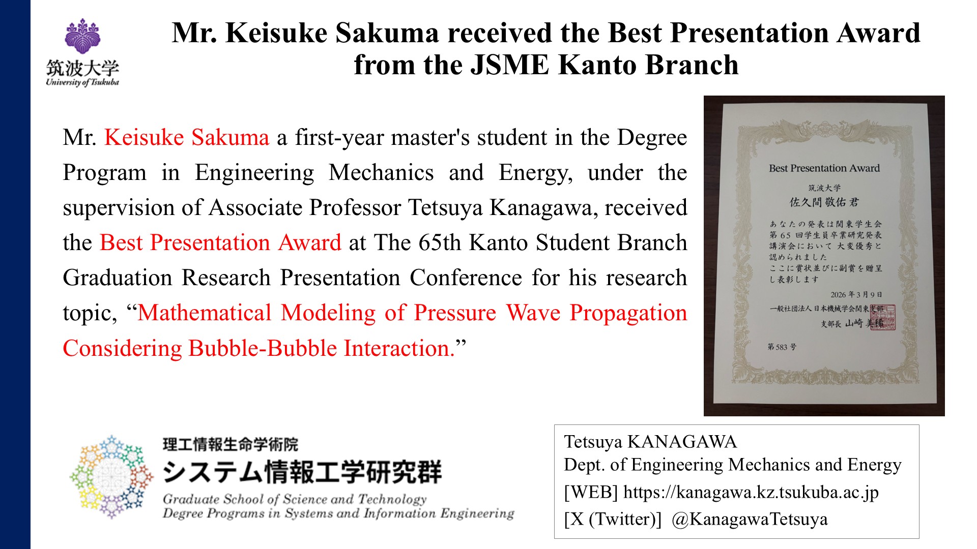 2026年4月17日 Apr. 17. 2026 佐久間敬佑氏が日本機械学会関東支部からBest Presentation Awardを受賞 Mr. Keisuke Sakuma received the Best Presentation Award from the JSME Kanto Branch